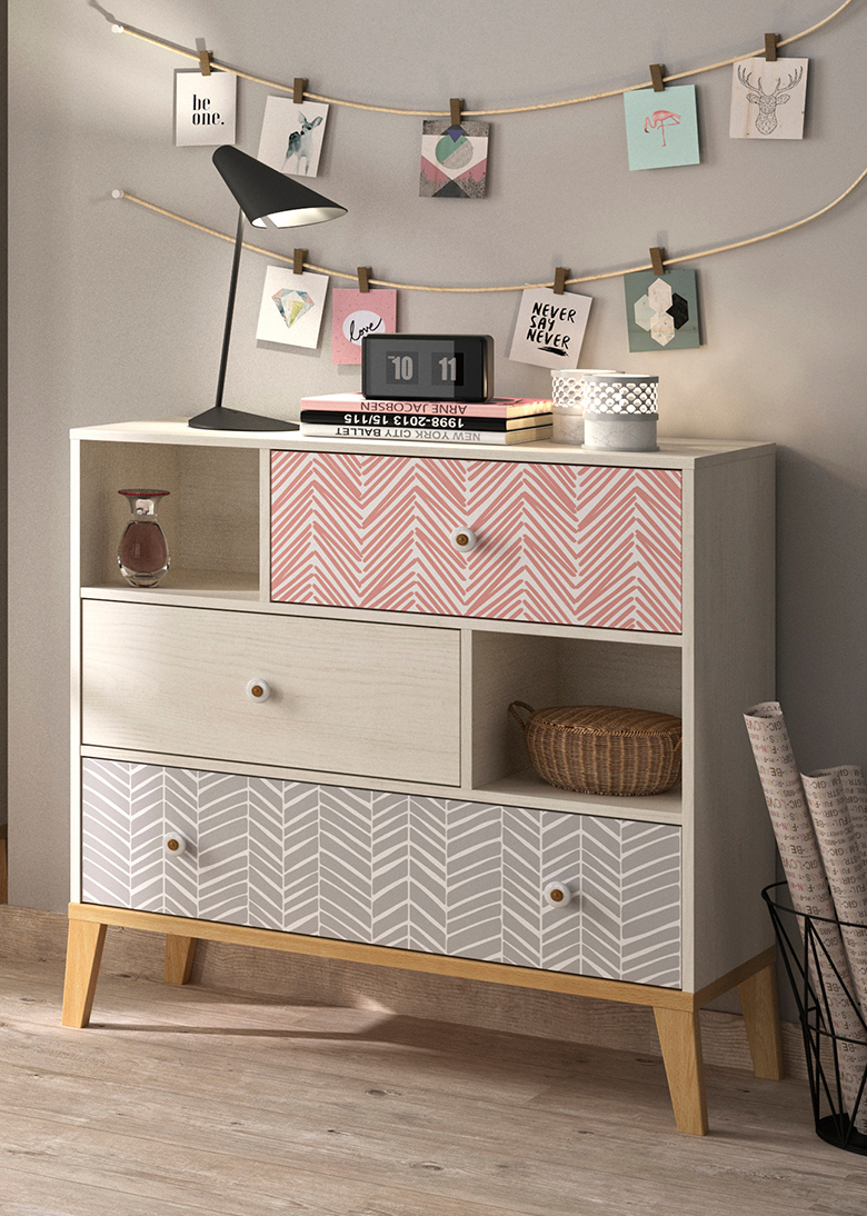 Αποτελείται από τρία ευρύχωρα συρτάρια καθώς και δύο ανοιχτούς χώρους αποθήκευσης. Αυτή η μεγάλη συρταριέρα έχει αίσθηση boho και μεγιστοποιεί τον αποθηκευτικό χώρο για τα ρούχα κάθε εποχής.