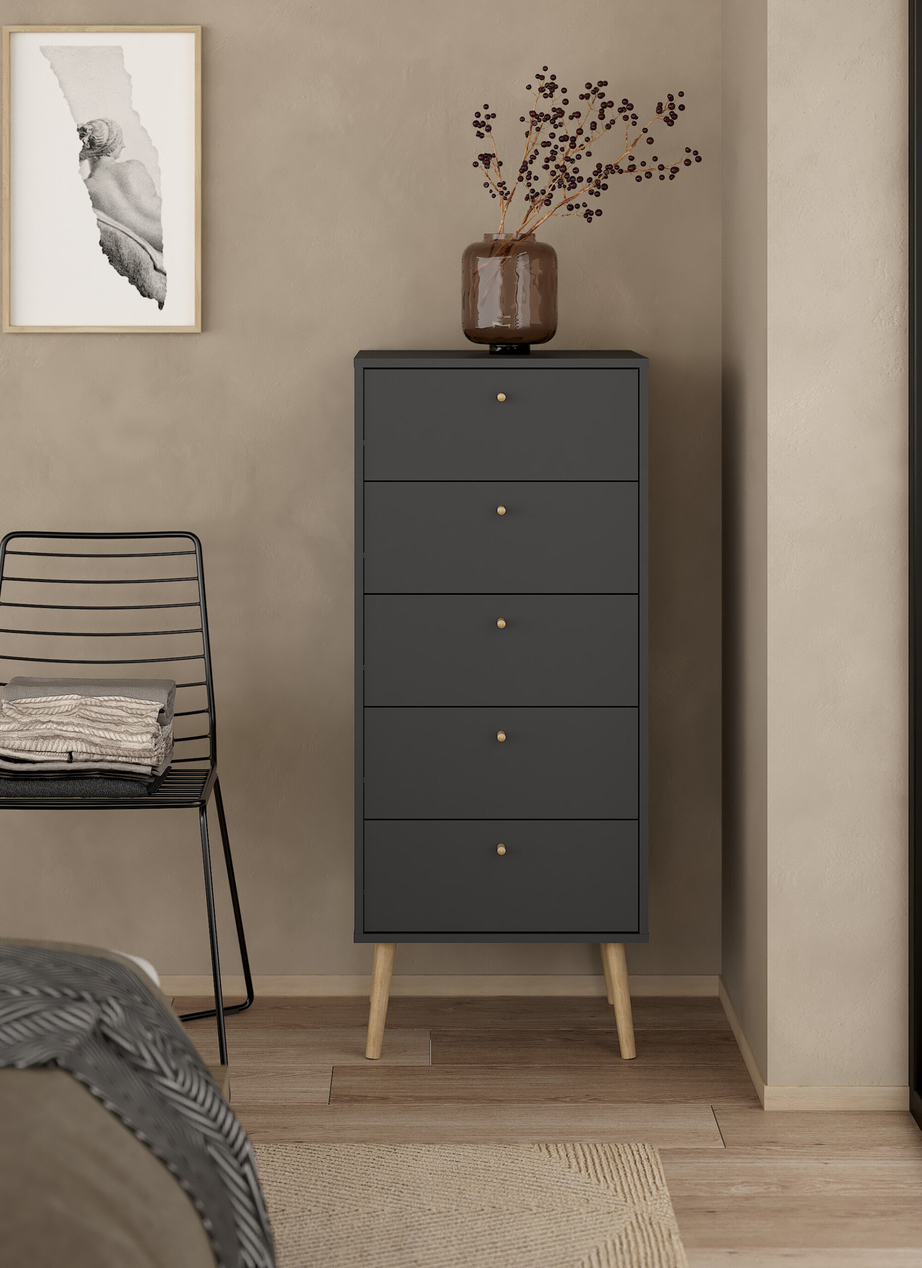 Η ψηλή συρταριέρα Bodo με το σκανδιναβικό της στυλ θα ομορφύνει το χώρο σας. Οι διαστάσεις της είναι  50×39εκ. ( ύψος 120εκ. ) και το χρώμα της γκρι. Διαθέτει 5 συρτάρια.  Η συρταριέρα Bodo κατασκευάζεται στη Δανία.