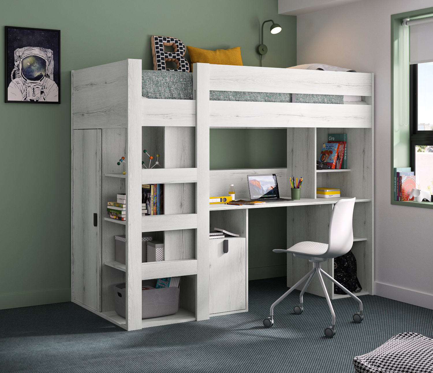 Το κρεβάτι Lugano είναι ένα εξαιρετικό "όλα σε ένα" επιπλο για το παιδικό υπνοδωμάτιο. Είναι στιβαρό και πρακτικό. Περιλαμβάνει κρεβάτι με σκάλα, γραφείο , βιβλιοθήκη και ντουλάπα με συρόμενη πόρτα. Είναι ιδανικό για δωμάτια με περιορισμένο χώρο. Οι διαστάσεις του είναι 205×99εκ. ( ύψος 169εκ. ) και το χρώμα του whitewashed oak. Διαθέτει επίσης βάση στήριξης για το στρώμα. Το "all-in-one" κρεβάτι Lugano είναι γαλλικής κατασκευής.
